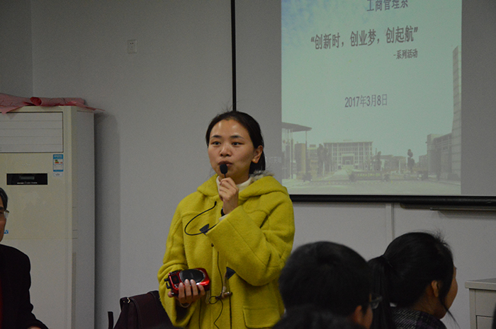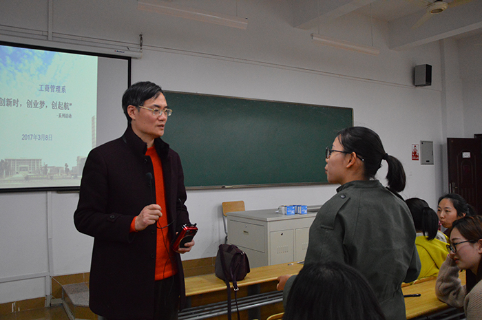 3月8日18时,工商管理系第一届“创新时,创业梦,创起航”主题系列活动第二场于8幢109报告厅正式开始。本次活动主讲人为我校创业学院常务副院长池水明,工商管理系副主任李玫昌,市场营销教研室负责人毛云飞以及各教研室的老师代表。本次参会的对象为工商管理系市场营销专业(14级,15级,16级),会展经济与管理专业(16级),体育经济与管理专业(15级)的全体学生。