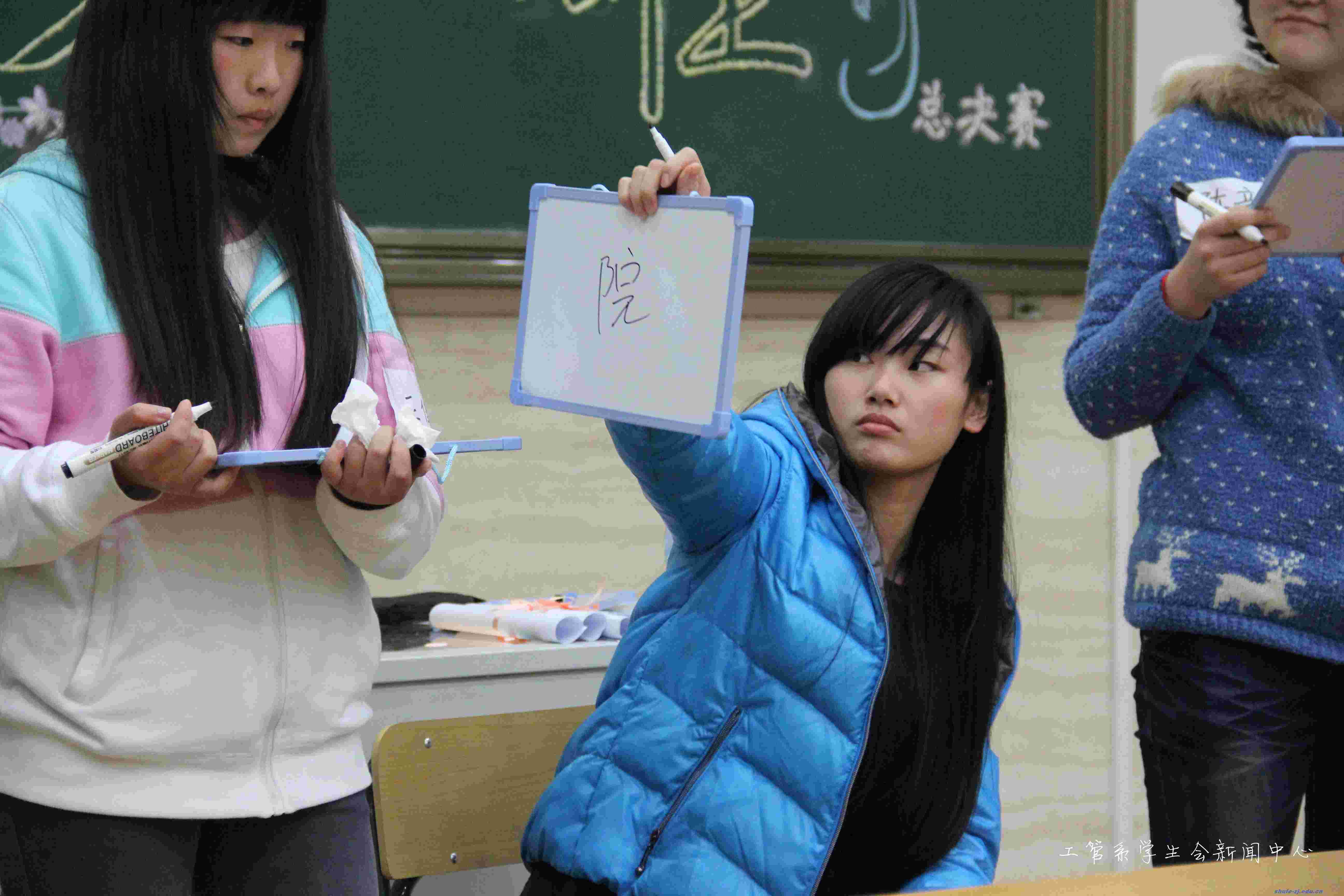 复赛之后,共有12位选手顺利进入了决赛。决赛分成三个小组,共有两轮。第一轮以四人为一组的选手进行对抗,每组淘汰两人。经过第一轮之后剩下的六位选手则进入下一轮,最后决出一等奖一名二等奖两名三等奖三名。在主持人娓娓动听的开场白过后,比赛宣布正式开始。第一轮首先上场的四位选手,主持人抽取的题目是轮流写出“汉语中用来描写十年后自己的字”,别出心裁的题目让场上的选手不约而同皱了下眉头,但面对难题,他们毫不示弱,片刻思索之后,便用娴熟的笔画在答题板上写出了答案。第一轮的比赛顺利的进行着,选手们的精彩表现都得到了现场观众热烈的掌声。在第二轮比赛到来之前,学习部精心设计了“观众互动”的环节,以与决赛相同的游戏规则,让现场观众也进行“PK”。这个环节不仅让观众们体会到了决赛比拼的紧张氛围,也再次活跃了现场气氛。紧接着,开始了“一撇一捺,用汉字点亮韶华”的比拼,参与第二轮决赛的六位选手都旗鼓相当实力不俗,对抗进入相持阶段。为了缓解比赛的紧张气氛,文娱部的小伙伴应遥还特意献上了一曲< <温柔>>。悠扬的歌声过后,比赛开始明朗化,最后来自13市营2班的徐慧同学拿下冠军.