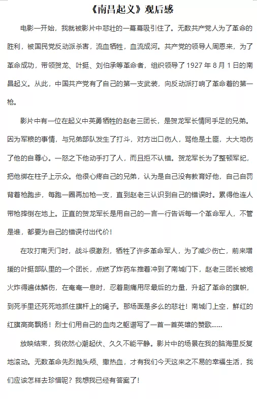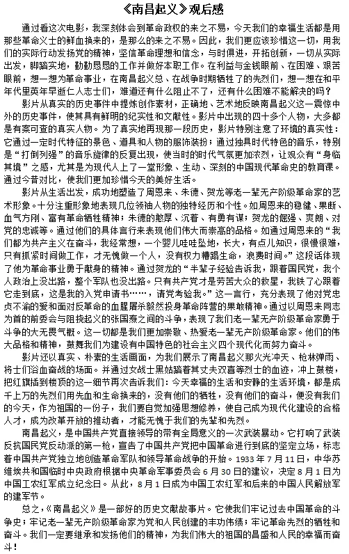 只听那一声枪鸣,黎明冲破了黑暗。武装反抗革命正式开始,跟随电影我们开始重新回顾那段峥嵘岁月。当我看到影片中革命志士们在领袖的正确领导和指挥下,奋勇杀敌时,我被先辈们的奋勇杀敌,舍生忘死的高涨精神所震撼。