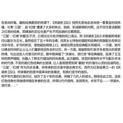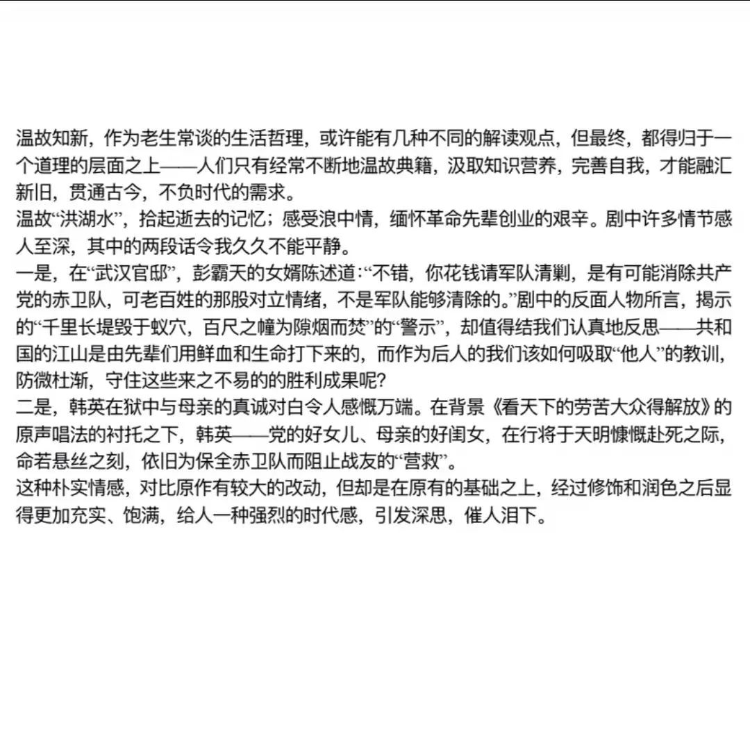 剧中慷慨赴死的人物造型与革命英雄主义的情节,以及精炼的台词让人陶醉其中,触景生情,引发深思——在富裕的生活中,在时尚的年代里,如何温故“典籍”,怎样缅怀革命先辈,从真正的意义上构建和谐的家园。