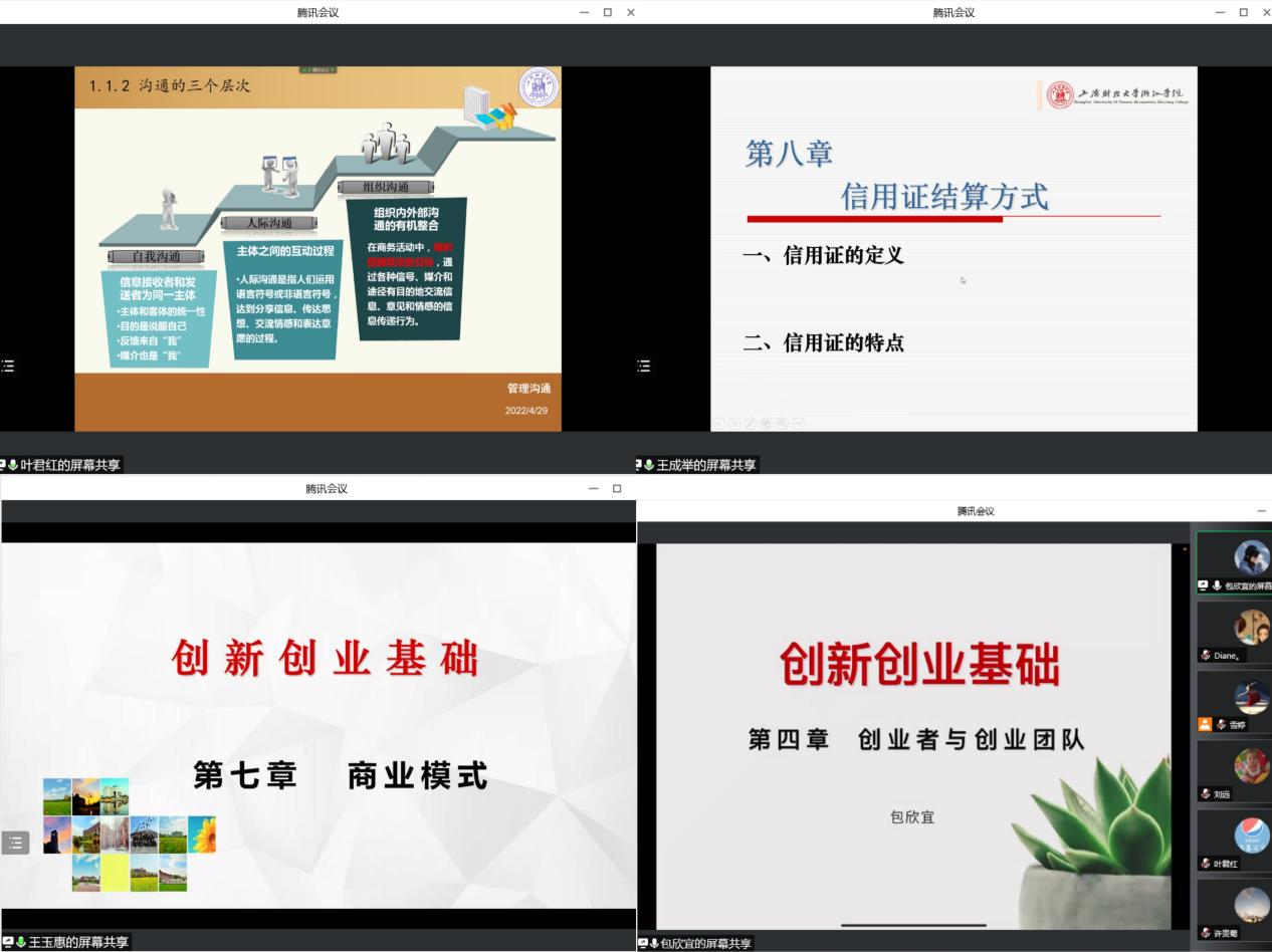 参加比赛的老师们八仙过海各显神通,准备充足,充分展示自己的教学才华,叶君红老师从日常生活中的沟通入手,以两个问题引入两项调查研究,通过分析得出“沟通是伴随一生的生存技能”,“组织沟通是企业管理的基础和核心环节”的结论;王成举老师以国际贸易为大背景,论述在国际贸易中债权债务交易风险,为降低交易风险引入信用证这一国际贸易结算方式;王玉惠老师通过回顾上周遗留问题的讲解,引入“最佳商业模式”这一话题,通过小组形式让同学们讨论熟悉咖啡店的经营模式,使之快速进入课堂学习。再用形象的比喻向同学们解释何为商业模式,得出“四核心”商业模式及商业模式涉及三个基本问题;包欣宜老师以视频展示为切入点,通过课堂模拟视频造雨的情景,让同学们切身体会到团队的力量。接着引入今天的内容—创业团队。以西游记团队和腾讯创业五兄弟等同学们熟悉的人物代入,让同学们更能明白创业团队的构成要素及组建原则。