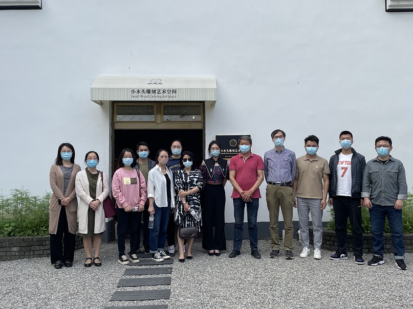 首先,师生一同参观村庄,实地感受新昌乔村的魅力所在。此次调研受到了新昌乔村村书记柯建康等人的热情接待。在柯书记的带领下,大家走访参观了新昌桥村。近年来,借助婺城乡创“7+X”模式,新昌桥村以“白沙隐宿文化村”为主题发展乡村旅游,通过打造村级文创产业,引入多个文创项目在新昌桥村落地,吸引不少游客前来游玩。其中,婺城区非物质文化遗产“竹木雕刻”代表性传承人廖江泺创立的“小木头雕刻艺术空间”,是首个入驻新昌桥村的项目。展厅里展示的木雕作品,无论是花鸟鱼虫还是人物,都惟妙惟肖、栩栩如生,传达出艺术的温度。
