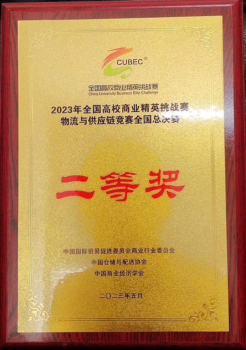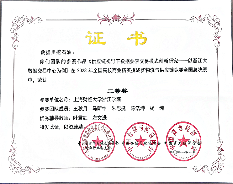 2023年5月20日至21日,2023年全国高校商业精英挑战赛物流与供应链竞赛全国总决赛在线成功举办。我院参赛团队“数据里挖石油”由来自工商管理系物流管理专业(王秋月,陈浩坤,杨纯)、统计系(马昕怡、朱思挺)五名学生组成,并由叶君红、左文进两位老师带队指导。我院代表队凭借参赛作品“供应链视野下数据要素交易模式创新研究——以浙江大数据交易中心为例”荣获全国二等奖。两名指导老师同时也分别获得“优秀辅导教师奖”。