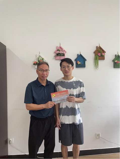 张慧忠老师将慰问金送给了潘旭东同志并与其进行了亲切交谈,深入了解了学生的学习、生活和家庭情况,鼓励他要坚定信念,勇敢面对困难,努力学习,为实现自己的人生目标而奋斗。他希望潘旭东同志要持续发挥好党员的先锋模范作用,为同学们树立榜样。潘旭东同志表示非常感谢学校的关爱和帮助,他将以更加饱满的热情投入到学习和工作中,不辜负学校的期望和信任。