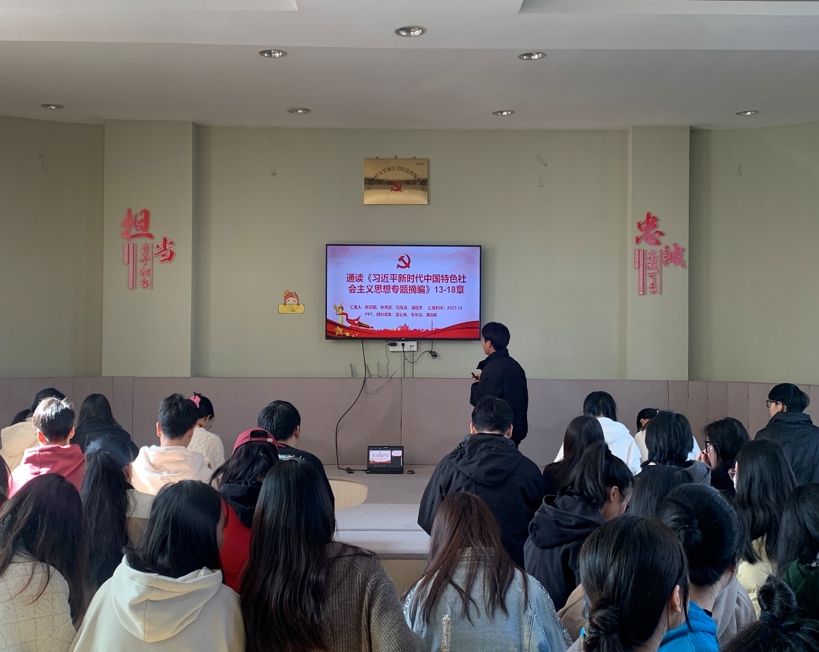 支部采用“班级领学”的形式进行,由各班党员同志带领大家一起学习,赋能主题学习,促进全体党员同志学深学透。本次由23工商管理专升本3班班级的党员同志们带领大家学习《习近平新时代中国特色社会主义思想专题摘编》,潘强龙、林秀磊、马海波、陈亚鹏四位同学主要从第十三章至第十八章的内容来引领全体党员全面解读《习近平新时代中国特色社会主义思想专题摘编》。随后,各位党员联系实际交流了各自的学习心得。