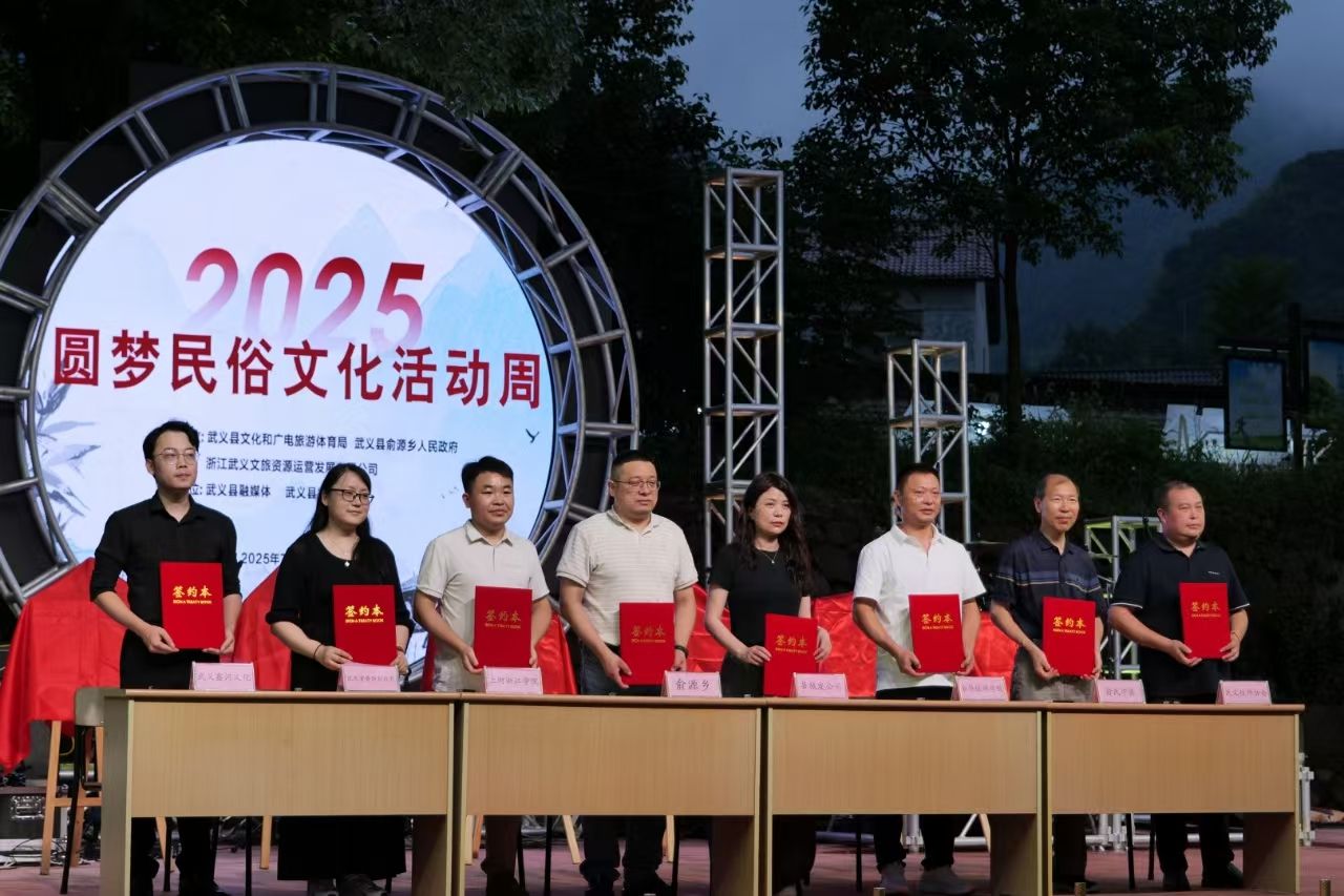 为深入推进高校党建“四个融合”,实现校地优势互补,以高质量党建引领业务高质量发展,促进党建工作与教学科研、人才培养、社会服务等各项工作深度融合。7月19日下午,学院工商管理系应邀参加武义县俞源乡“2025俞源圆梦民俗文化活动周”开幕式并签署校地党建联建合作签约。武义县俞源乡党委书记戴军武、俞源乡乡长杨子江、武义县委宣传部副部长王胜、武义县文广旅体局副局长连国平、工商管理系副主任熊璞等参加签约仪式,仪式由俞源乡副乡长金亚楠主持。
