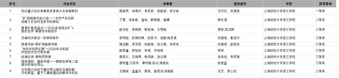 本届大赛中,上财浙院学子表现亮眼,创下学校参赛以来的优异战绩——最终斩获1项金奖、1项银奖及7项铜奖,更在会展新消费专项赛道实现奖项零的突破,展现出强劲的专业实力。参赛团队在文本策划、视频创作等关键环节中精准把控行业趋势,融入创新理念,其专业表现赢得评委一致好评。