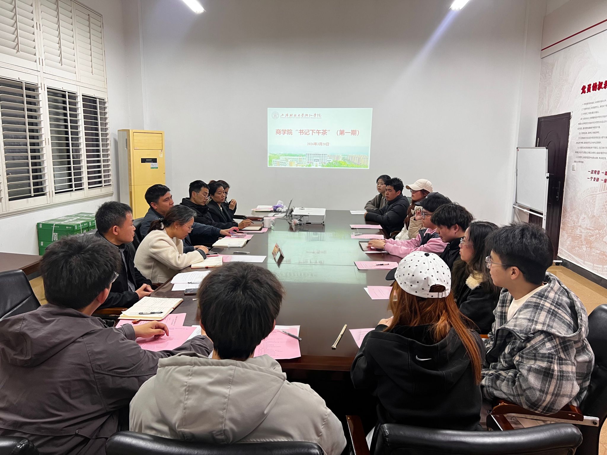 为进一步畅通师生沟通渠道、精准对接学生需求,3月20日下午,商学院首期“书记下午茶”活动在29幢114会议室举行。校党委副书记杨喆俊出席并讲话,学生工作部部长韦金红,商学院党委书记、副院长徐天南,党委副书记、纪委书记熊璞及相关科室负责人参与活动。
