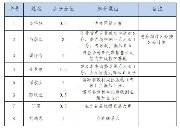 4.举办、承办大型学术教学论坛的主要负责人(如浙中创业论坛、双月论坛等)加1分。