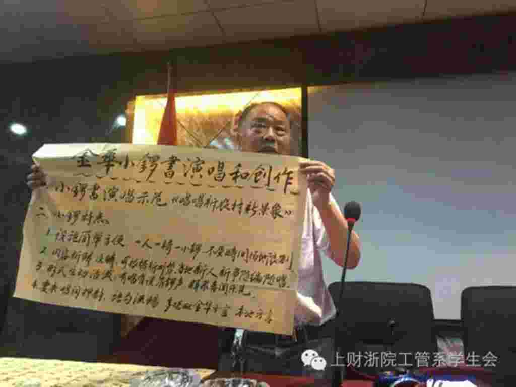 金店村和任老师及志愿者队伍还特意请来了撰写《文化金店》的金志馀老师给小朋友上课,老师被小朋友们簇拥着上台,并由小朋友给老师系上他们骄傲的红领巾。老师在课堂上给小朋友们说唱金华小锣曲,曲中唱到感谢党为我们建设好家园,我们要爱共产党,坚持步子跟党走。金老师还带着小朋友学习锣曲,这不仅是是文化的延续,更表现了我们对祖国对党的自豪!