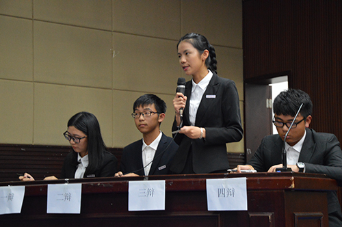 一方辩手陈述自己的观点时,另一方认真倾听,毫不示弱,奋笔疾书写下对方言辞中的漏洞,以便下一轮辩论回击。