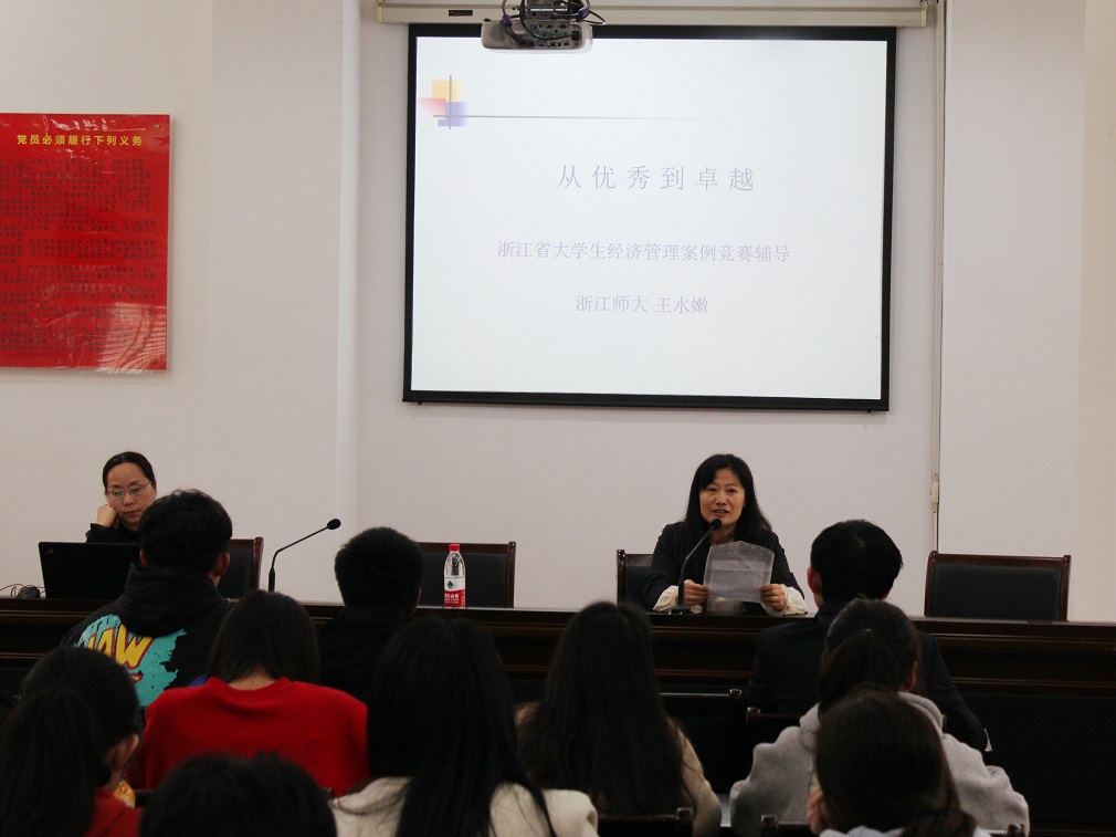 2021年4月15日,工商管理系学生会有幸邀请到了浙江师范大学经济与管理学院工商管理专业硕士生导师——王水嫩老师,她曾连续三届获得了大赛优秀指导老师的称号。今天,她为有意参赛的同学进行了一场经济案例分析大赛的赛前指导讲座。