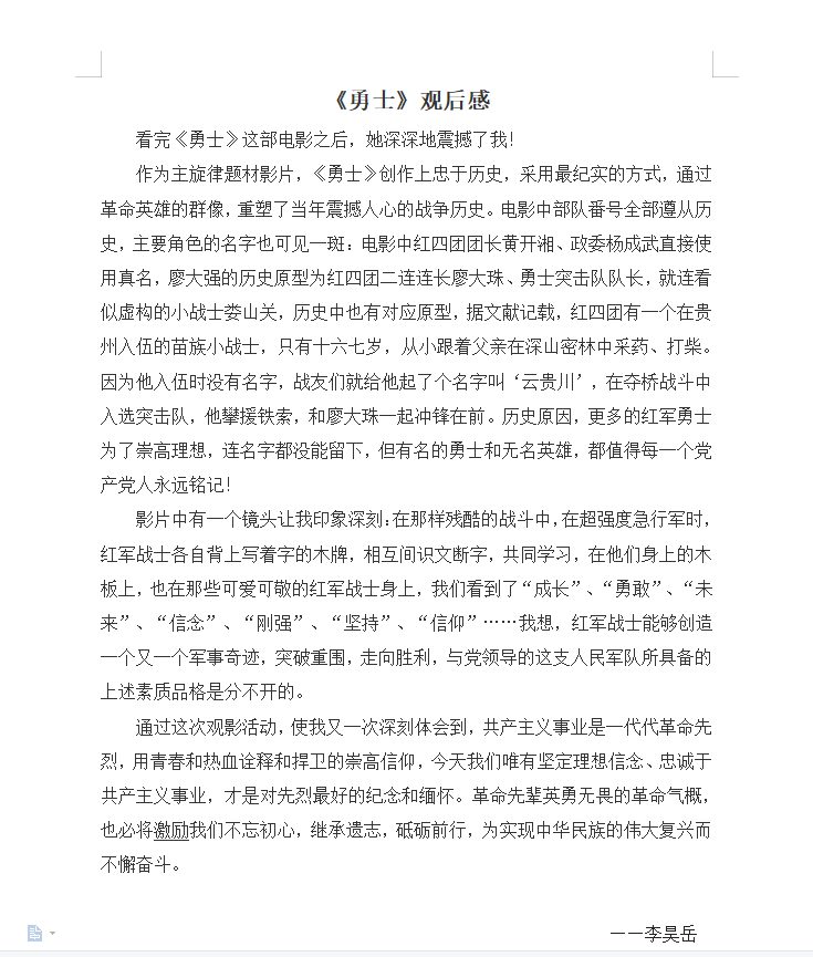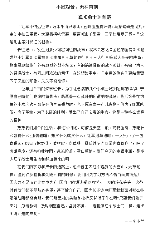 勇士们这种舍生忘死、锲而不舍、一往无前的革命精神值得我们深思也值得我们学习。在今天这个和平年代,我们也同样应该弘扬长征精神,面对困难与挫折,要像影片中的勇士那样勇往直前、踏踏实实、认认真真地做好每一件事。同时我们也应该像勇士那样抱定坚定理想信念,走向更好的明天。