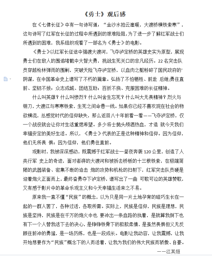 本周五,红色放映室为大家带来了影片《勇士》。这部影片讲述了1935年5月红军飞夺泸定桥惊心动魄的真实革命历史事件。影片再现了红军勇士们与敌人斗智斗勇,团结合作,舍生忘死,最后战胜敌人的情景。影片中,让我印象最深的情节是,当敌人拆除了桥上的木板,红军的二十三名突击队员,靠着必胜的革命意志,顽强地飞夺了光秃秃的十三根铁锁链的天险,勇士们一个个扒在锁链上交替匍匐前进。尽管炮火声震耳欲聋,我们的红军依然冒险奋勇向前,最终成功夺下了泸定桥。