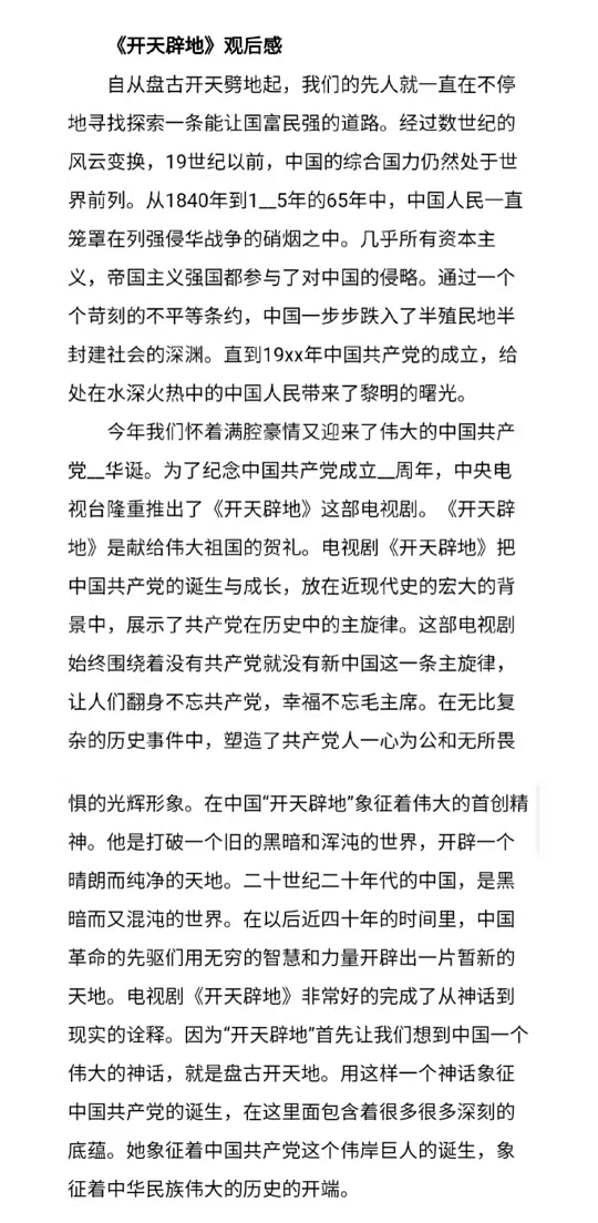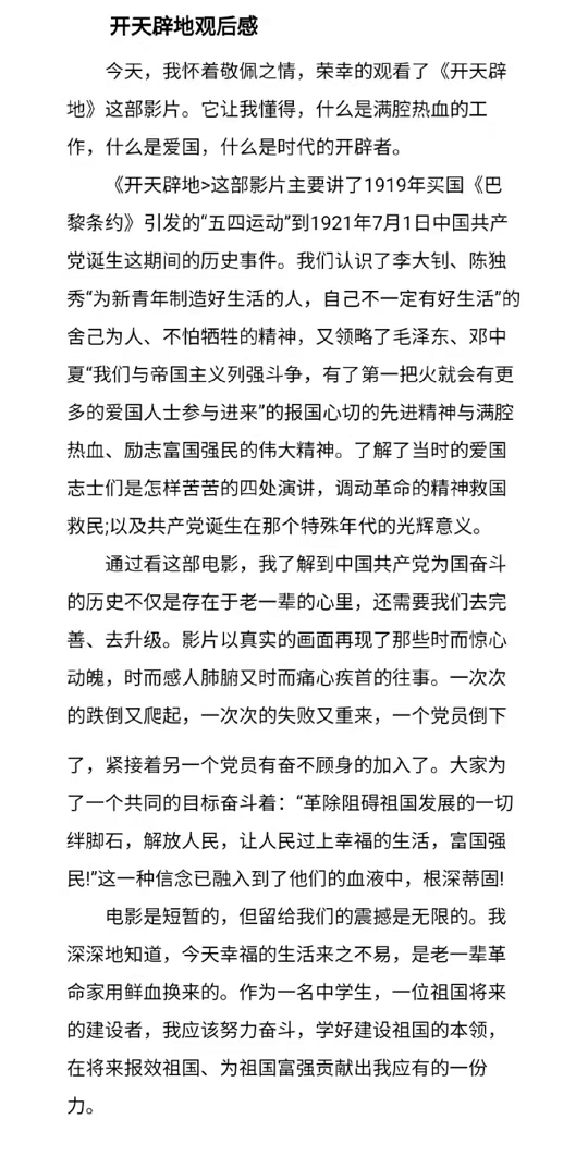 影片中,陈独秀因宣传马克思主义被捕,他的儿子去阴暗的狱中看望他时,一句“没事,我很好",将革命伟人的奉献精神淋漓尽致地展现出来,令人震撼!"星星之火,可以燎原”,“开天辟地,从无到有”。陈独秀、李大钊等伟人突破国际各股复杂势力的监控和追踪,于1921年7月23日召开中共一大,自此,开启了中国的新篇章!通过影片,我们更能体会到建党时的不易与艰辛,更要珍惜如今来之不易的幸福生活。