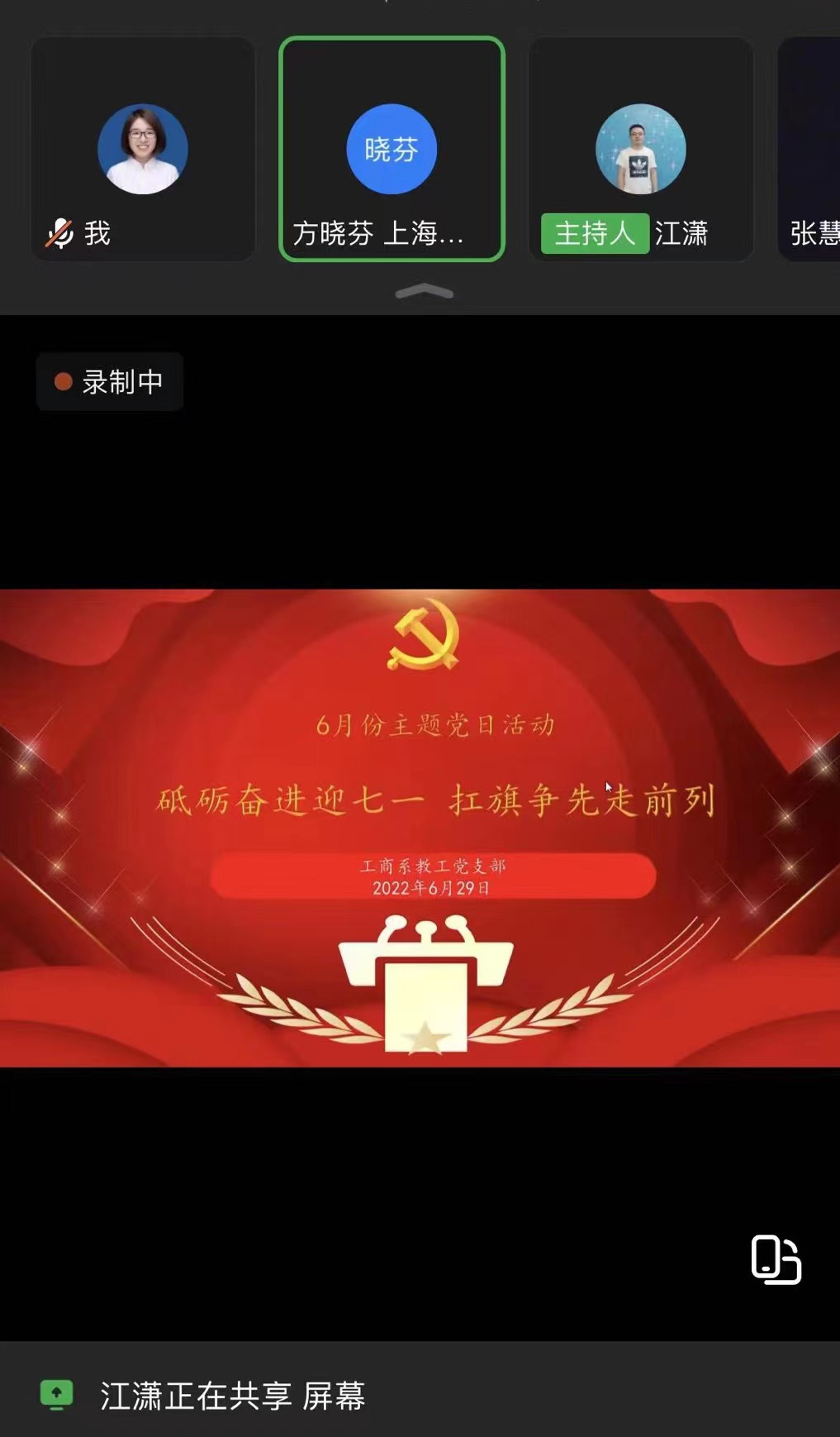 为继承和弘扬党的优良传统,充分激发党员奋勇拼搏的使命责任,在七一建党节来临之际,工商系教工支部于6月29日晚,在钉钉群召开了“砥砺奋进迎七一扛旗争先走前列”线上主题党日活动。会议由教工支部组织委员江潇主持,全体教工党员参加。
