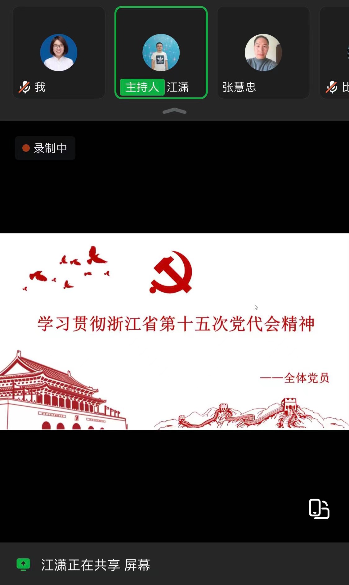 首先,支部组织委员江潇借用“10个新”梳理了省十五次党代会报告的重点内容。一是新主题标注新方位。主题是报告的灵魂,本次党代会的主题是:高举习近平新时代中国特色社会主义思想伟大旗帜,忠实践行“八八战略”,坚决做到“两个维护”,在高质量发展中奋力推进中国特色社会主义共同富裕先行和省域现代化先行!二是新成就奠定新起点。报告总结了近五年浙江取得的9个方面的历史性成就和8条规律性认识。基于这些成就和认识,浙江发展站上了新的更高起点。三是新遵循指引新征程。5大战略指引、11方面重要遵循是推动习近平新时代中国特色社会主义思想在浙江生动实践,指引浙江推进中国特色社会主义共同富裕先行和省域现代化先行的行动指南。四是新目标催生新打法。报告里提出了实现“两个先行”奋斗目标和打造“8个高地”具体目标。要实现这个目标离不开五大工作导向和“10个着力”。五是新锻造铸就新作为。推进“两个先行”,关键是党。要全面落实新时代党的建设总要求,大力弘扬建党精神,严格落实管党治党政治责任,纵深推进全面从严治党,不断推进以党的自我革命引领社会革命在浙江生动实践。