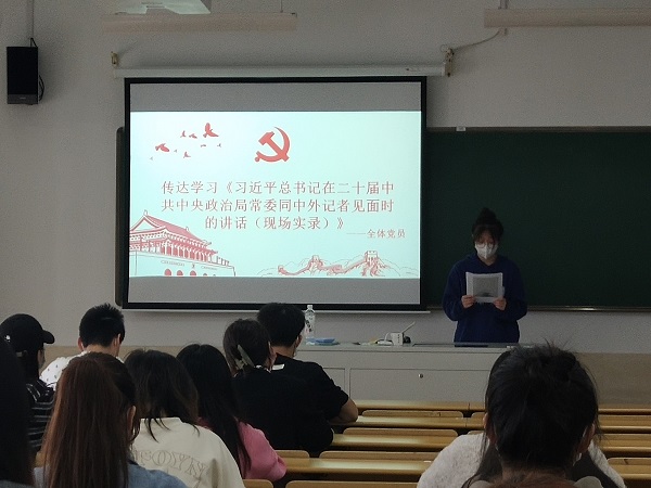 2022年10月31日12:30,工商管理系第二学生党支部于7-408开展以“学习二十大,奋进新征程”为主题的党日活动。本次党日活动由工商管理系第二学生党支部书记盛奥同志主持。本次党日活动应到党员78名,实到73名,请假5名,旷会0名。