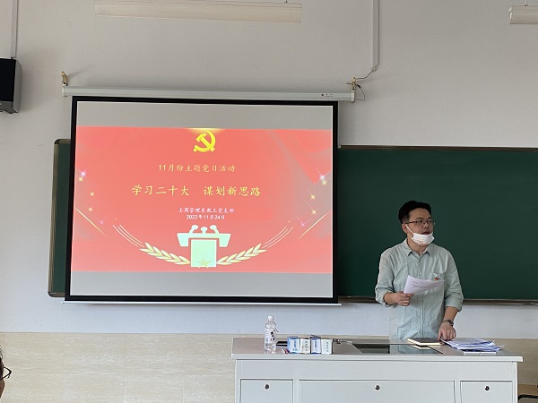为深入学习贯彻党的二十大精神,凝聚奋进新征程的向心力,砥砺奋进谋划系部发展新思路。11月24日中午,工商系教工支部于7-410开展“学习二十大,谋划新思路”主题党日活动。教工支部组织委员江潇主持活动,党支部全体教工党员参加。