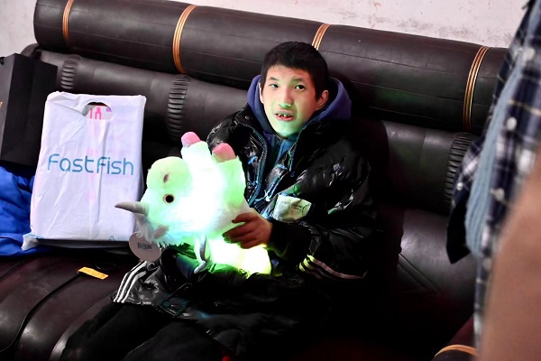 已18岁的小越弋在见到此次志愿者带去的小兔子与鞋子开心得露出了笑容。越弋爷爷向第一次参加活动的志愿者们介绍了小越弋的情况,在小越弋爷爷与老师交流的过程中,小越弋安静地捧着会发光的兔子坐在沙发上,时不时与志愿者们玩耍。七十多岁的爷爷开朗地与老师们交流小越弋的现状,不见半分对生活的埋怨,更多的是对财浙学子的关心,那乐观积极的生活态度打动着在场的每一个人。他说道:“天气再冷,总要出去赚点钱,能养他(小越弋)一天是一天。“轻描淡写的几句难言,让老师与同学们心绪波澜。