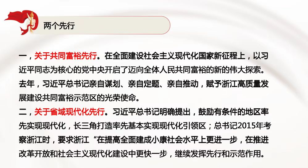 党课第四部分,于晓丹同志带领大家学习认识今后五年奋斗目标。奋斗目标:在高质量发展中实现中国特色社会主义共同富裕先行和省域现代化先行。