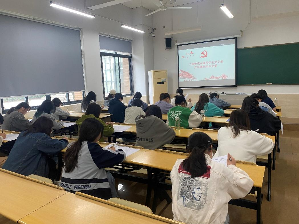 为深入学习贯彻党的二十大精神,贯彻落实习近平总书记关于全面从严治党重要论述,进一步强化党员同志廉洁自律意识,5月11日中午,工商管理系第四学生党支部开展党风廉政知识竞赛,测试合格率达到100%。
