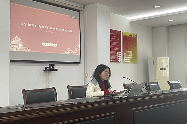 最后,丁瑾同志结合《浙江省教育厅办公室关于违反教师职业行为十项准则典型案例的通报》材料为大家上了一堂以“遵守职业行为准则 做新时代育人师表”为主题的党课,强调作为高校教师,我们要以践行准则的实际行动树好新时代教书育人师表形象,不触碰红线底线,身正为范。课后,教工党员们以师德师风为主题结合自身实际开展了学习讨论,蒋曼曼、于晓丹代表同志们发言:坚持以德立身,规范从教行为,坚决杜绝一切有损师德的言行。我们要做到廉洁奉公,自重自爱。