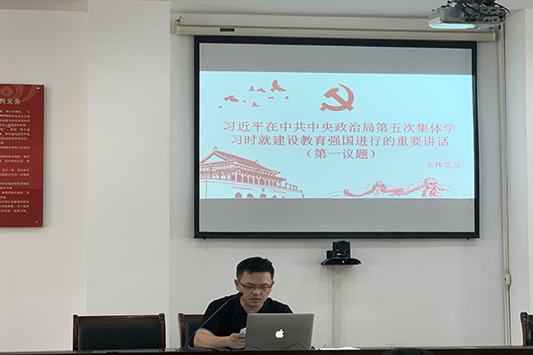 会上,首先由支部组织委员江潇同志带领大家共同学习了“第一议题”:习近平在中共中央政治局第五次集体学习时就建设教育强国进行的重要讲话以及习近平在文化传承发展座谈会上的重要讲话。他指出习近平总书记强调加快建设教育强国为中华民族伟大复兴提供有力支撑,并且强教必先强师,因而加强师德师风建设,引导广大教师坚定理想信念坚守三尺讲台,潜心教书育人更是必然之举。